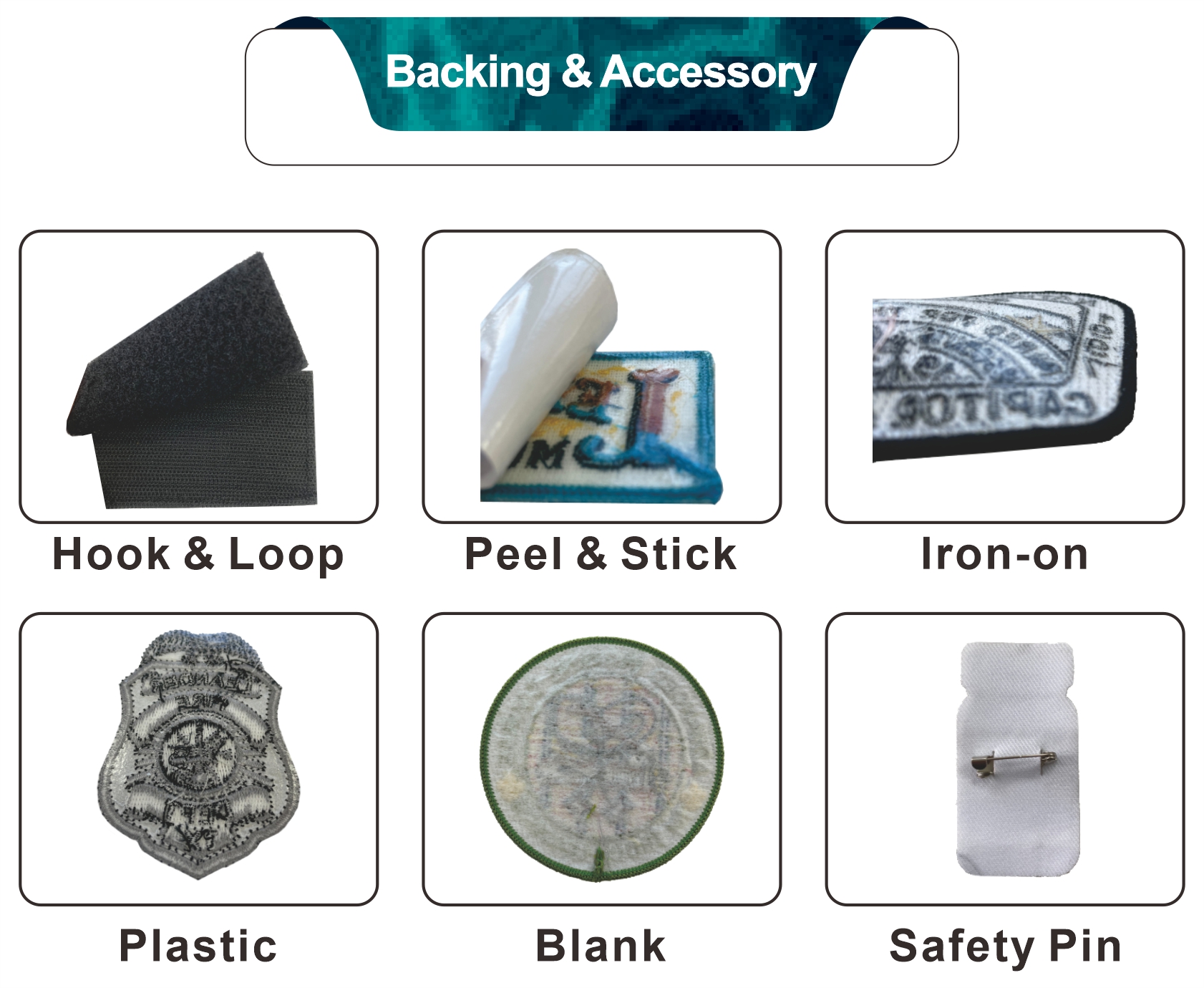 Backing: Plastic Backing, Iron-on Backing, Adhesive backing, Velcro Backing, Paper Backing
